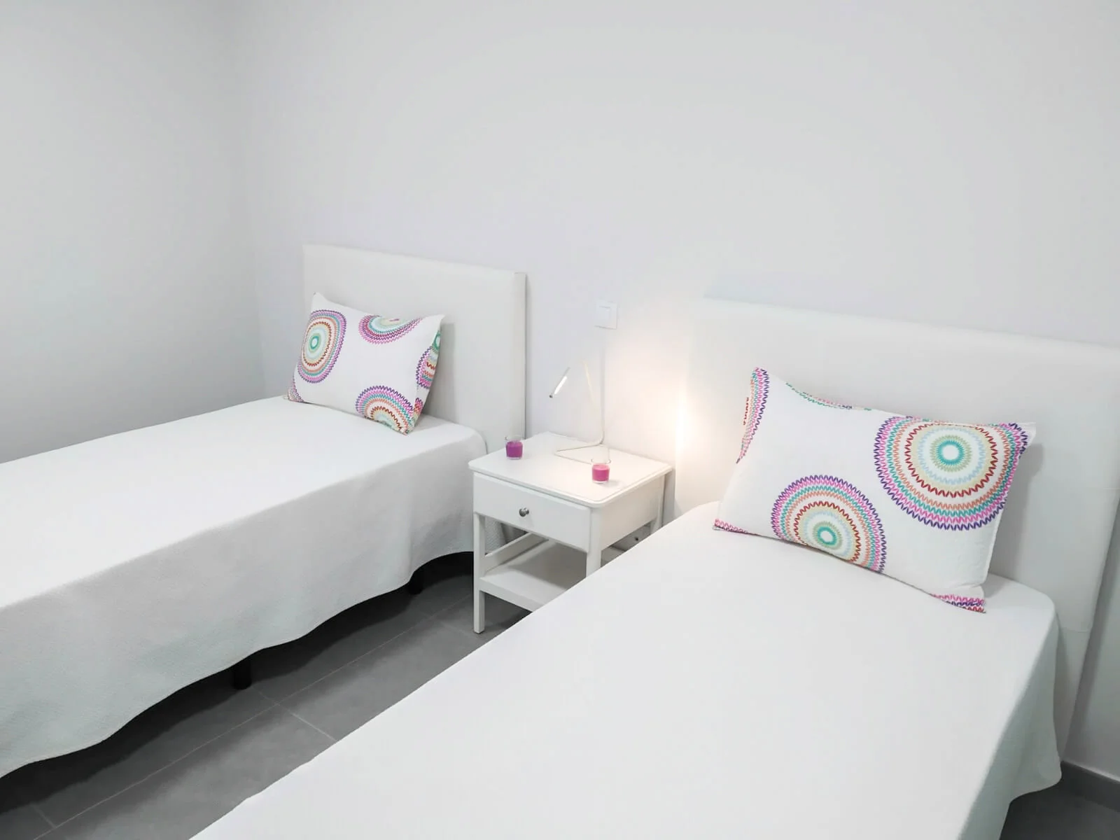 This luxury apartment is very tastefully decorated throughout. Each of the two bedrooms has two single beds and wall to wall built in wardrobes. The front bedroom has opening balcony doors out on to the front terrace.